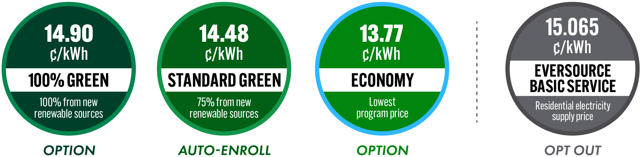 Cambridge Community Electricity offers three options for the electricity supply price on your Eversource bill. As a new participant, you will be automatically enrolled in Standard Green. Two other options are available by request. Make the choice that’s right for you!