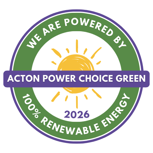 The Acton Power Choice GREEN Badge is available as a high-quality digital visual for use on your website, promotional materials, and/or as a window cling for display at your business or organization site. The badge says that your organization has committed to using 100% renewable electricity, and shows your support for sustainability to both online and in-person visitors. For additional visibility, when you use the badge, we can also list your business or organization on this web page. The badge is renewed annually based on your current subscription to Acton Power Choice GREEN.