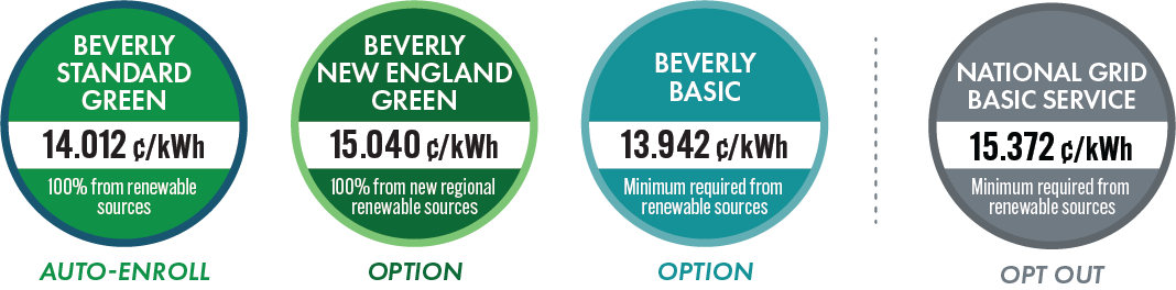 Important program news:In January 2026, current Beverly Community Electric prices will expire and new, near-level, 22-month prices will take effect. In addition, most participants will receive electricity that is 100% from renewable sources for a price that is lower than National Grid’s current residential and commercial Basic Service prices. To reflect the program’s increased commitment to renewable energy, the Beverly Standard program option name will change to Beverly Standard Green, and the Beverly 100% Clean program option name will change to Beverly New England Green. See the new prices. |