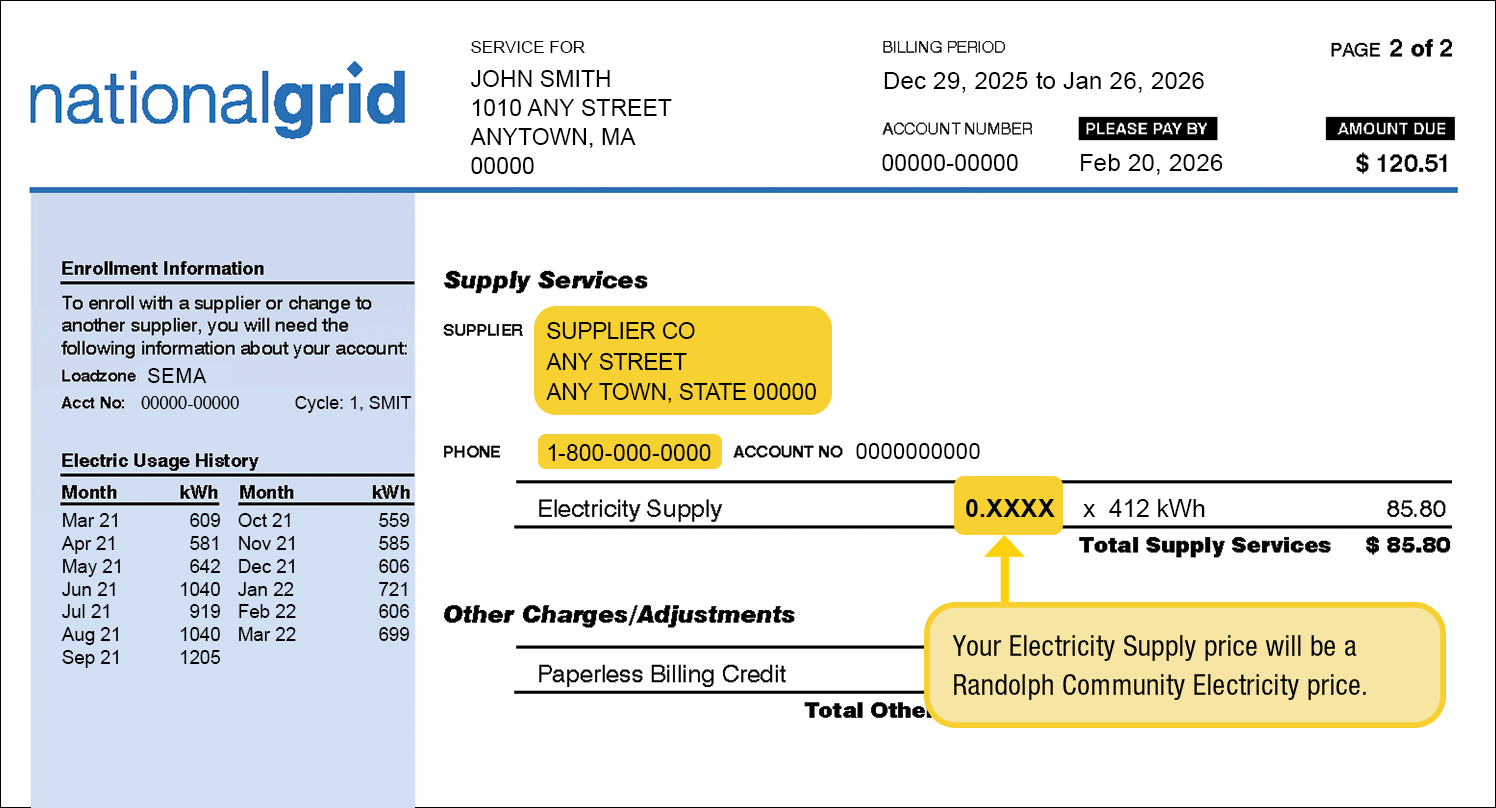 Randolph Community Electricity will be integrated into your existing National Grid electric bill, giving you a new price for your Electricity Supply charge. But you will not see any additional charges on your bill or receive any additional electric bills because of participating in the program.