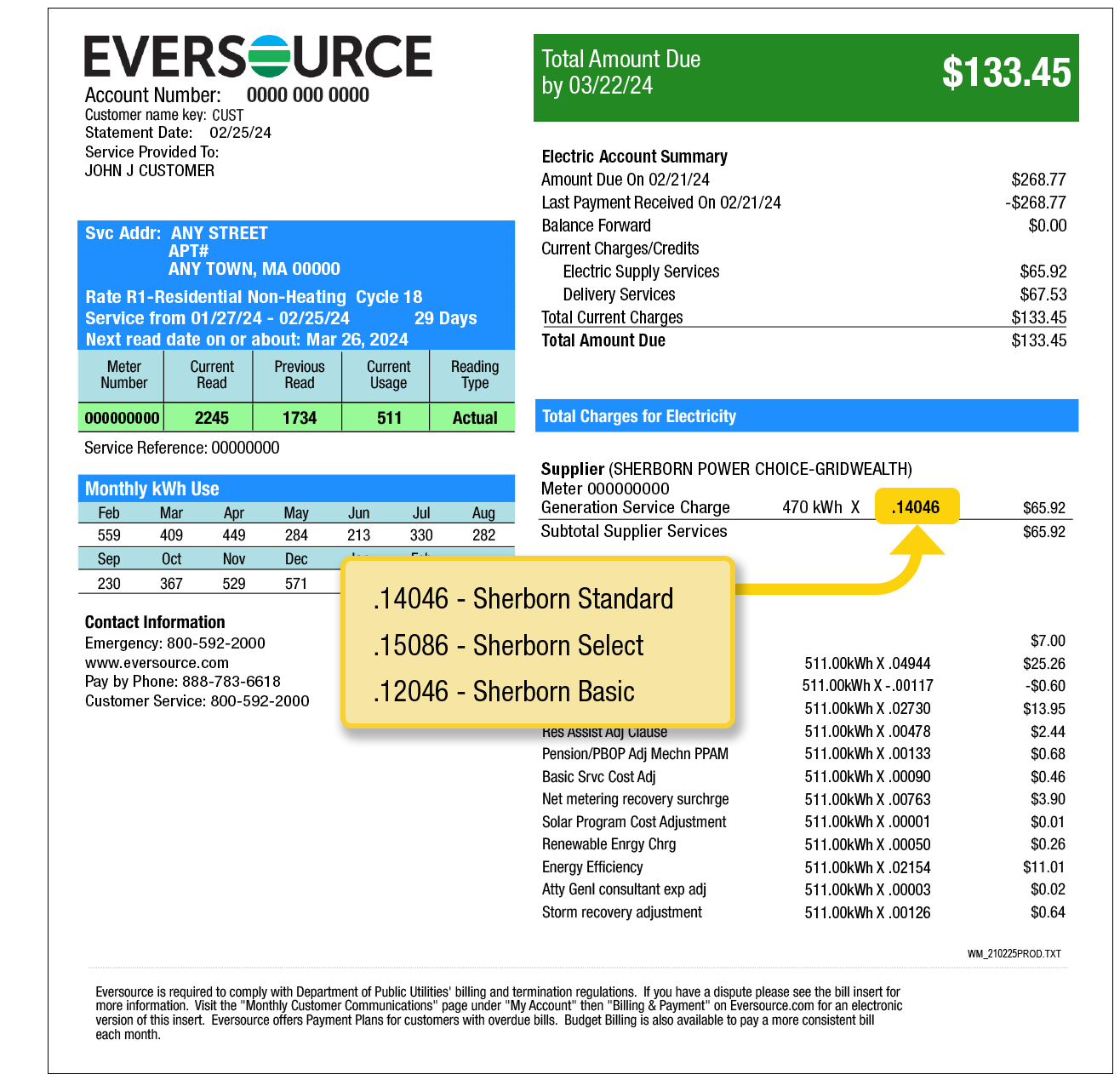 Sherborn Power Choice is a group electricity purchasing program from the Town of Sherborn for Sherborn residents and businesses. The program impacts the Supply charge on your Eversource electric bill.