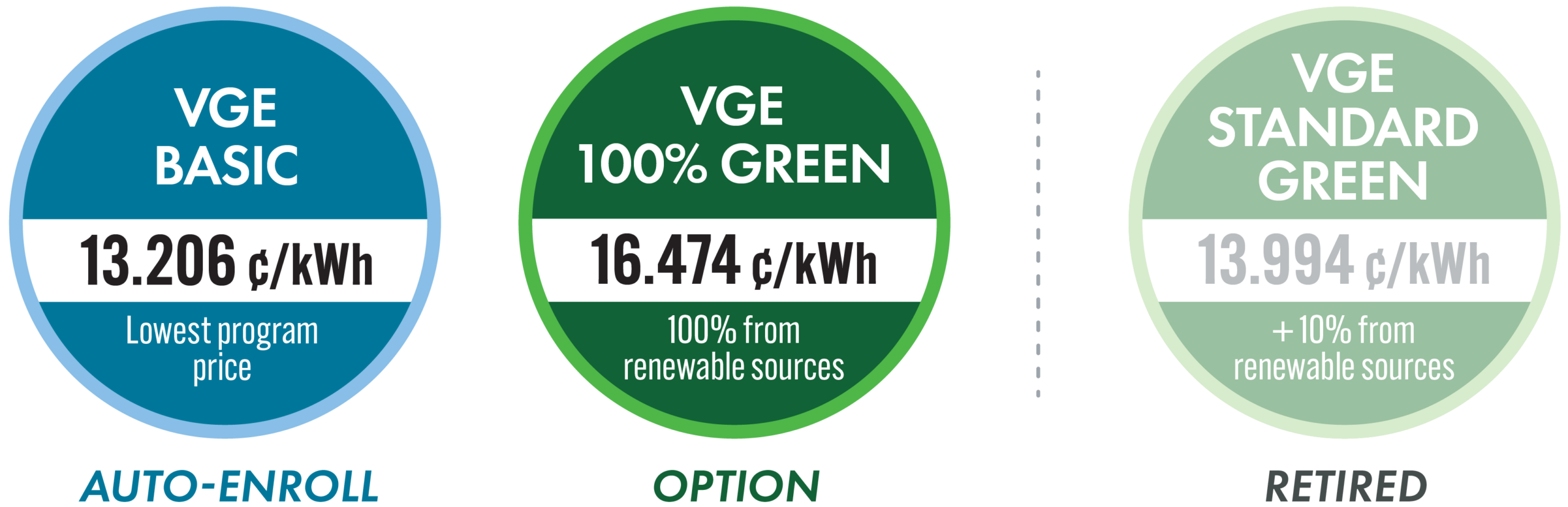 Important program news:In May 2026, participants currently enrolled in VGE Standard Green and VGE Basic will automatically transition to a new, lower-priced VGE Basic price of 13.206 ¢/kWh. This change is designed to provide immediate financial relief on electricity bills while navigating a shifting renewable energy market. Learn more about this decision. Most program participants are enrolled in the VGE Standard Green option, and participants in both the VGE Standard Green and VGE Basic options will automatically see the new, lower price on their June 2026 electric bills. Read the official announcements from Amherst and Northampton. |