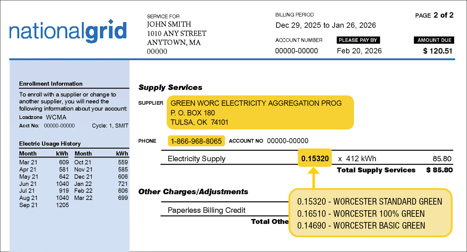 You will not see any additional charges on your National Grid electric bill or receive a separate bill from the Green Worcester ElectriCITY Municipal Aggregation Program.